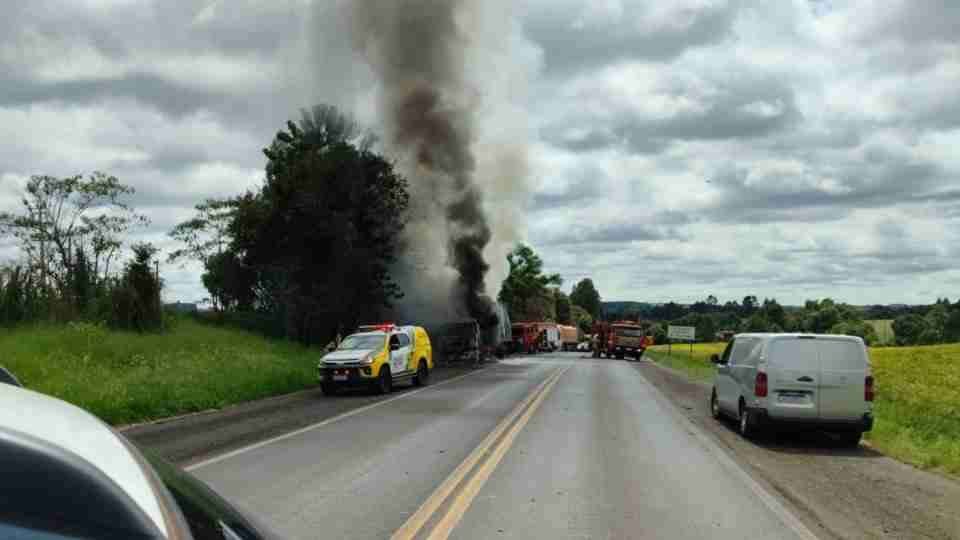 Caminhão pegou fogo e interditou totalmente a BR-158 no km 507, em Coronel Vivida, no sudoeste do...