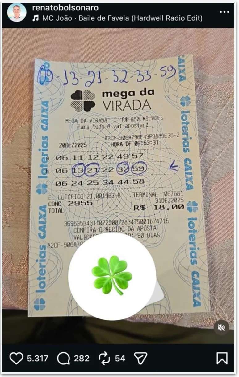 Nas redes sociais, Renato Bolsonaro divulgou o comprovante da aposta, registrada no dia 20 de dezembro, com os números 06, 13, 21, 22, 32 e 59. No sorteio, foram extraídas as dezenas 09, 13, 21, 32, 33 e 59, resultando em quatro acertos: 13, 21, 32 e 59. O valor investido no bolão foi de R$ 18.