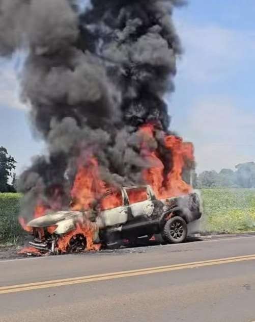 Uma caminhonete Ford Ranger foi completamente destruída por um incêndio no início da tarde desta quinta-feira (5), na PR-158, no trecho entre Coronel Vivida e Pato Branco, no Sudoeste do Paraná.
