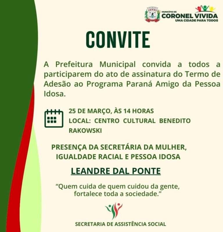 Com a assinatura do termo, Coronel Vivida será oficialmente Amigo da Pessoa Idosa, o que vai proporcionar várias ações importantes para o público da melhor idade. Além disso, mais detalhes sobre o Complexo Social Cidade Amiga da Pessoa Idosa serão apresentados.