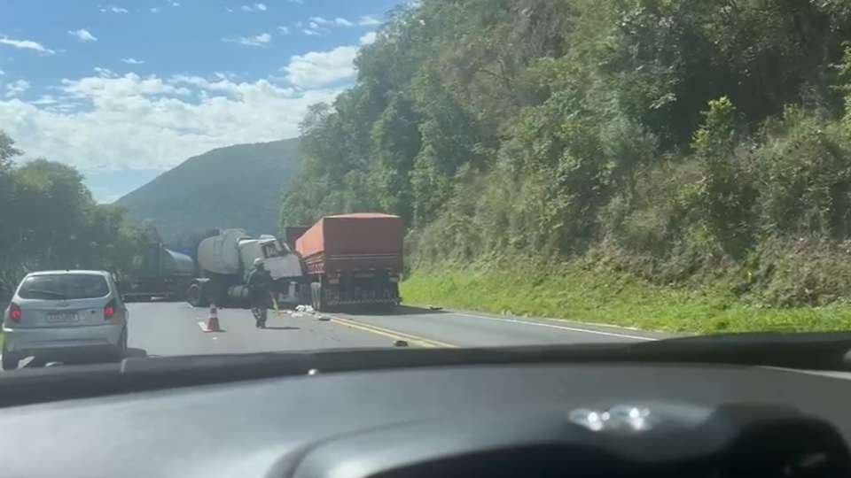 Acidente entre dois caminhões interditou parcialmente a BR-277, no quilômetro 313, em Prudentópol...