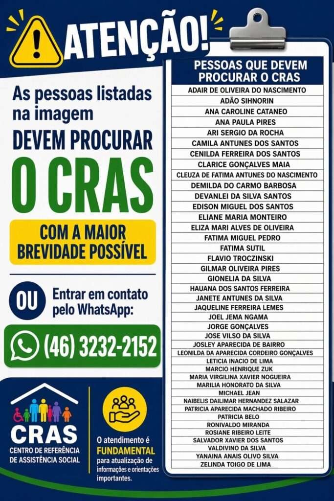 A lista em questão apresenta pessoas que devem procurar o CRAS imediatamente. Caso você não possa comparecer, entre em contato via WhatsApp (46)32322152, para tratar assunto de seu interesse.
