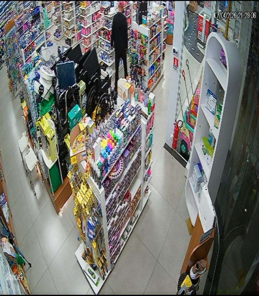 Por volta das 22h30, a equipe Charlie da Polícia Militar, da 1ª Companhia do 21º BPM, realizava patrulhamento preventivo quando foi acionada para atender a ocorrência. No local, a funcionária relatou que o suspeito, vestido com roupas escuras, entrou no estabelecimento e subtraiu alguns objetos, deixando o local sem efetuar pagamento. O ato foi registrado pelo sistema de monitoramento interno.